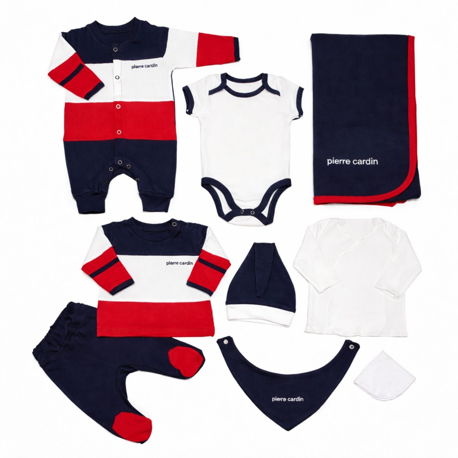 Një set i plotë dhe shumë praktik nga Pierre Cardin, i dizajnuar për rehati maksimale dhe stil modern që nga ditët e para të bebes suaj. Kombinimi klasik i ngjyrave blu marine, e bardhë dhe e kuqe e bën këtë komplet ideal për çdo sezon .