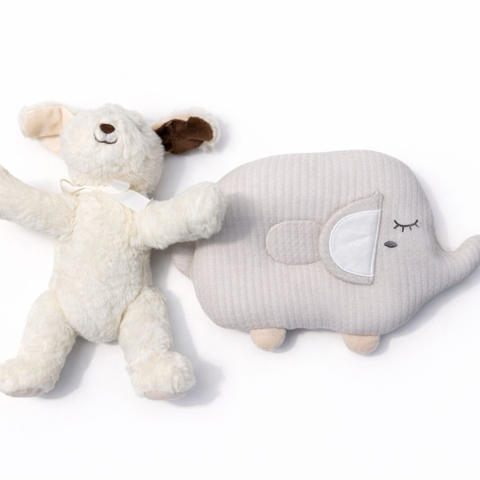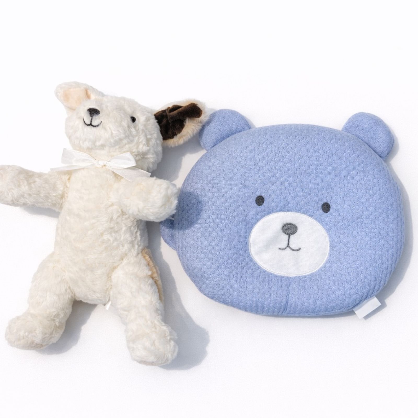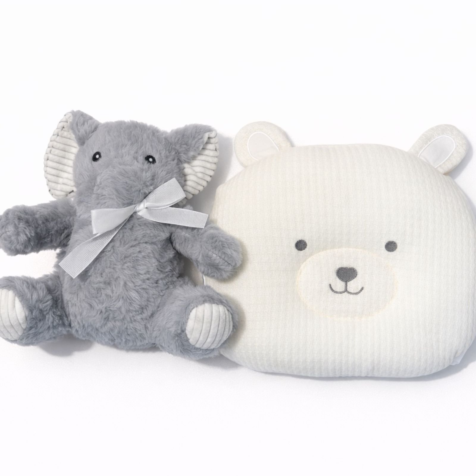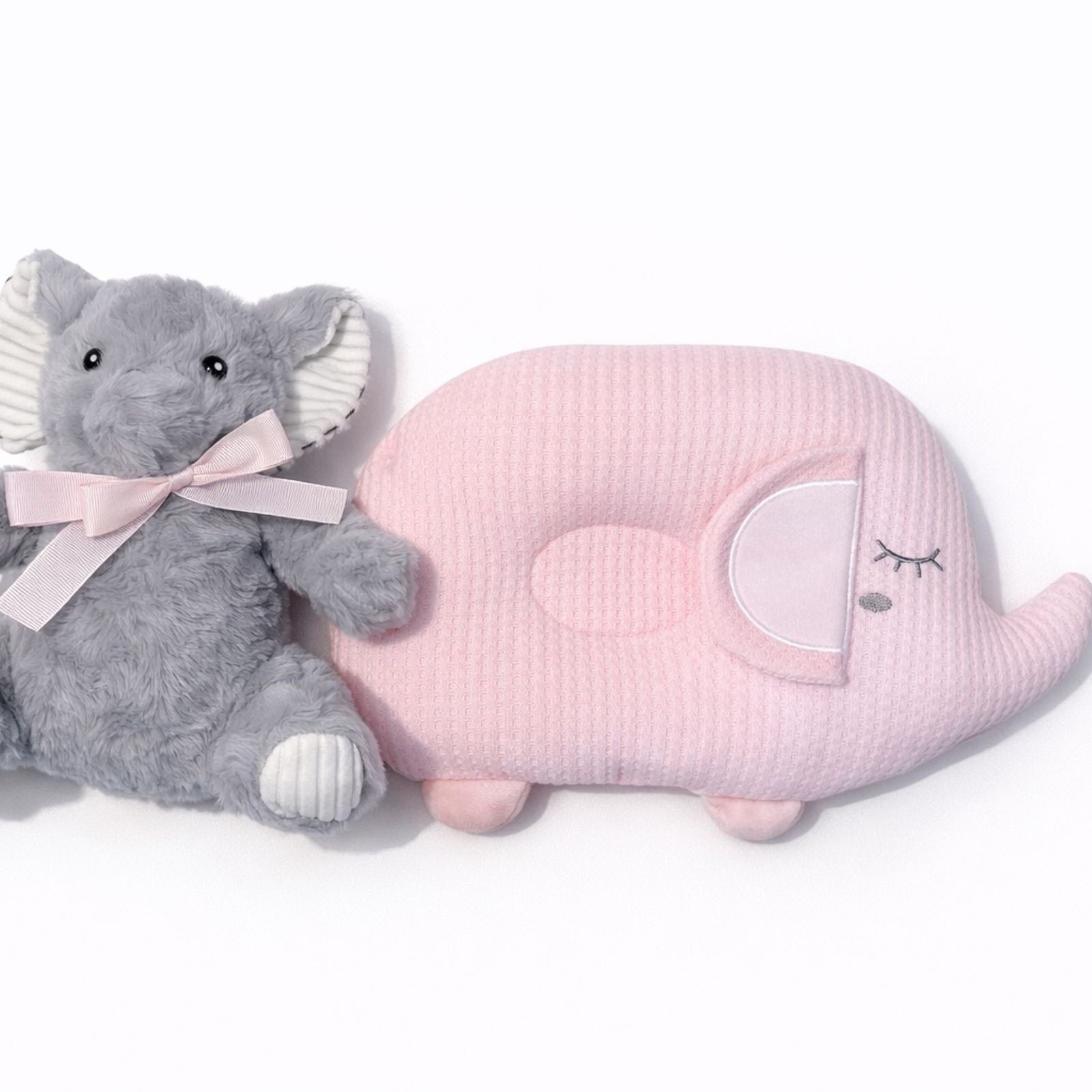 Set i ëmbël dhe praktik për bebe që përfshin jastëk ergonomik dhe lodër pelushi. Ideale për rehati dhe argëtim njëkohësisht.