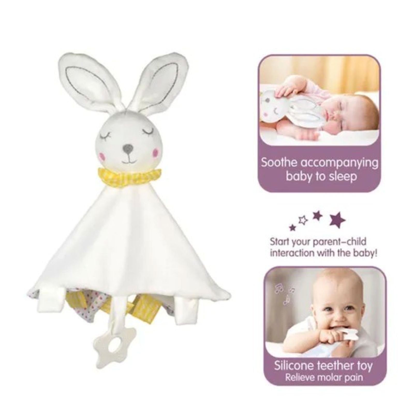 Kjo lodër qetësuese në formë lepuri është ideale për foshnjat që nga muajt e parë. E dizajnuar për të ofruar rehati gjatë gjumit dhe për të ndihmuar në lehtësimin e dhimbjeve të daljes së dhëmbëve, ajo kombinon një batanije të butë me një dhëmbëzues silikoni të sigurt për bebe.
