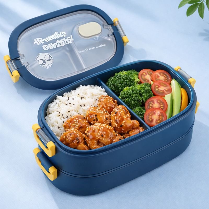 Kjo lunch box dy-katëshe është ideale për përgatitjen dhe ruajtjen e vakteve të plota dhe të balancuara për fëmijë. Me ndarje të brendshme praktike, lejon organizimin e ushqimeve të ndryshme si oriz, mish, perime dhe fruta pa u përzier mes tyre. Dizajni i hapur e bën të lehtë aksesin në ushqim dhe e bën vaktin më tërheqës për fëmijët.