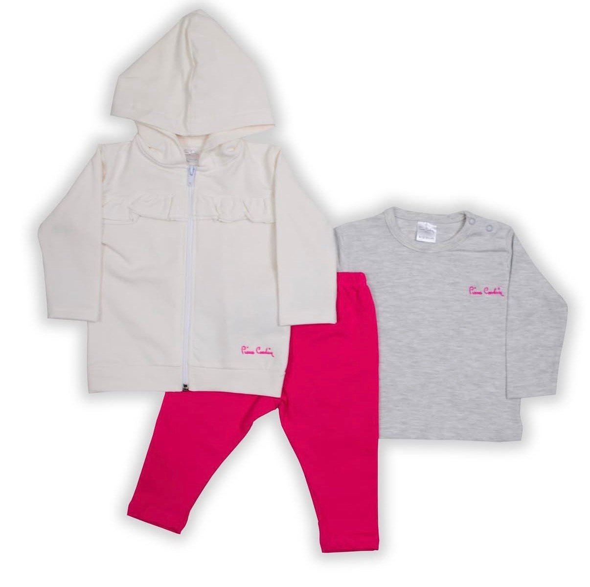 Set shumë praktik dhe elegant për bebe nga Pierre Cardin, i përbërë nga 3 pjesë: xhup me kapuç, bluzë me mëngë të gjata dhe pantallona komode. Kombinimi i ngjyrave neutrale me rozë të ndezur e bën këtë set perfekt për një pamje të ëmbël dhe moderne.