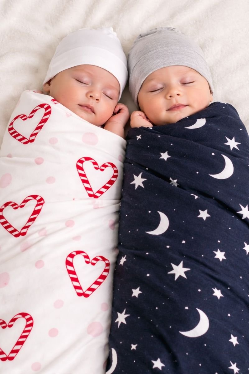 Ky set elegant përfshin dy batanije swaddle të buta dhe cilësore, të dizajnuara për t’i ofruar bebit rehati dhe ndjenjë sigurie që në ditët e para. Njëra batanije vjen në ngjyrë të çelët me motive zemrash dhe pika delikate, ndërsa tjetra në ngjyrë të errët me yje dhe hënë, duke krijuar një kombinim të bukur dhe modern.