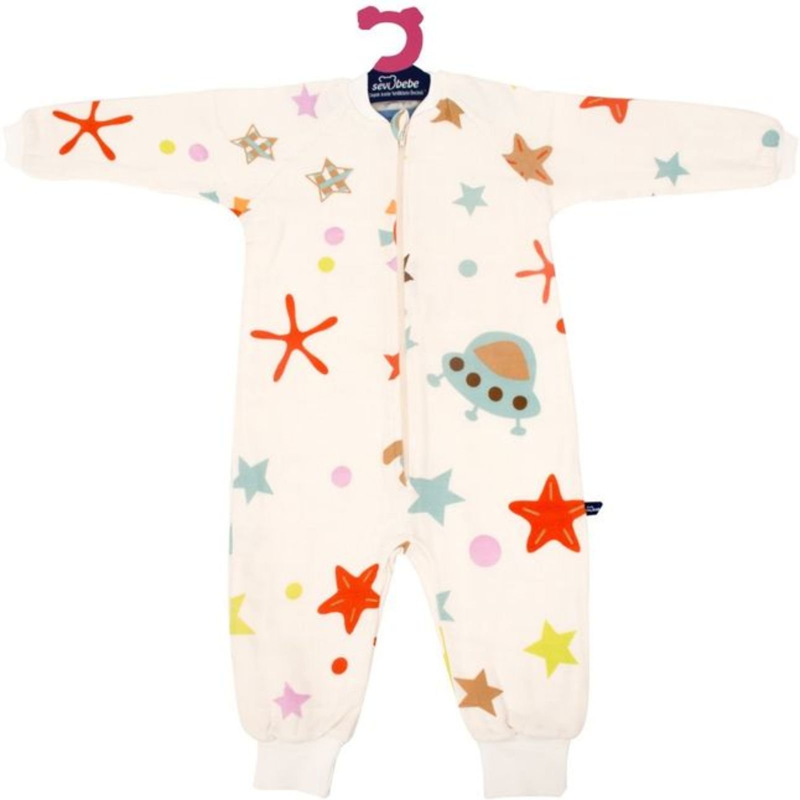 Materiali i butë dhe i rehatshëm është i përshtatshëm për lëkurën e ndjeshme të fëmijëve, ndërsa zinxhiri i përparmë e bën veshjen dhe zhveshjen të shpejtë dhe praktike. Printimet me yje dhe forma të ndryshme shumëngjyrëshe i japin një pamje të gjallë dhe argëtuese.