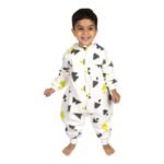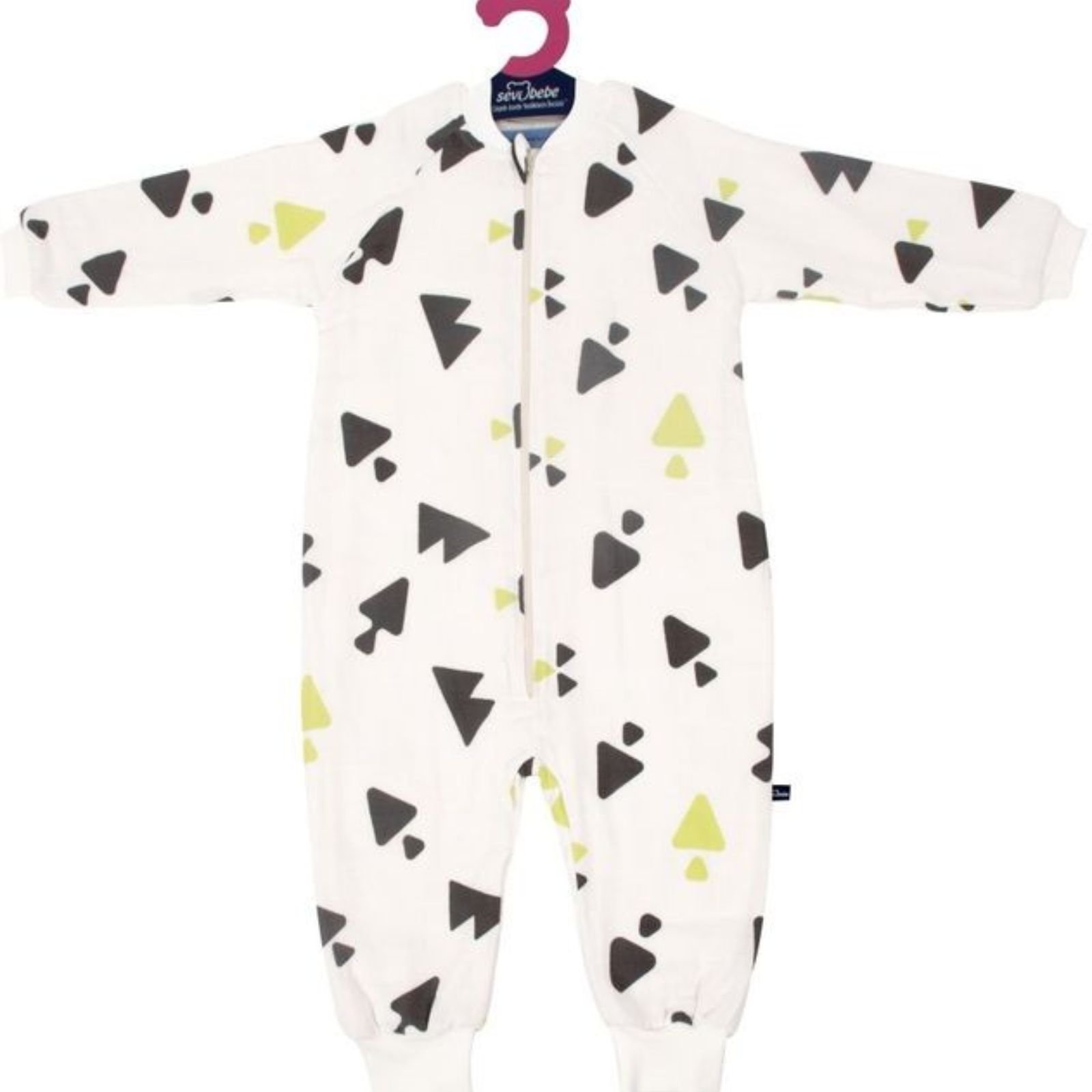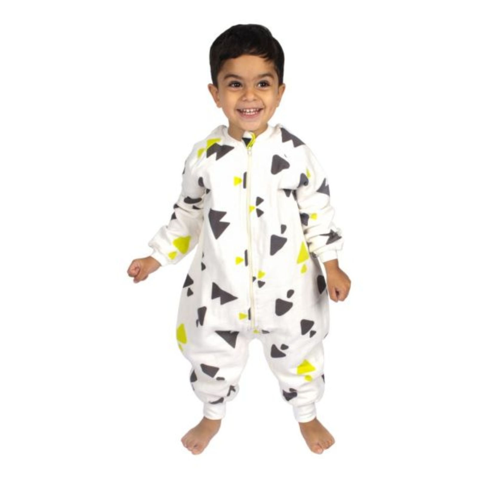 Materiali i butë dhe i rehatshëm është i përshtatshëm për lëkurën delikate të fëmijëve. Zinxhiri i përparmë e bën veshjen dhe zhveshjen shumë të lehtë për prindërit. Dizajni modern me forma gjeometrike në ngjyra gri dhe të verdhë i jep një pamje të veçantë dhe të këndshme.